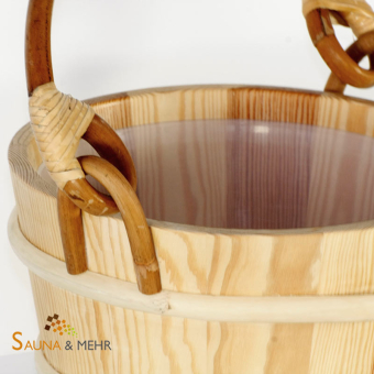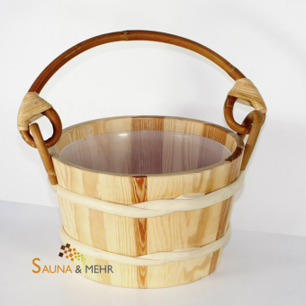 Aufguss Holzkübel aus Nadelholz in massiver Ausführung mit Kunststoffeinsatz Fassungsvermögen 4 Ltr. Mit klassischem und praktischem Rattanhenkel.