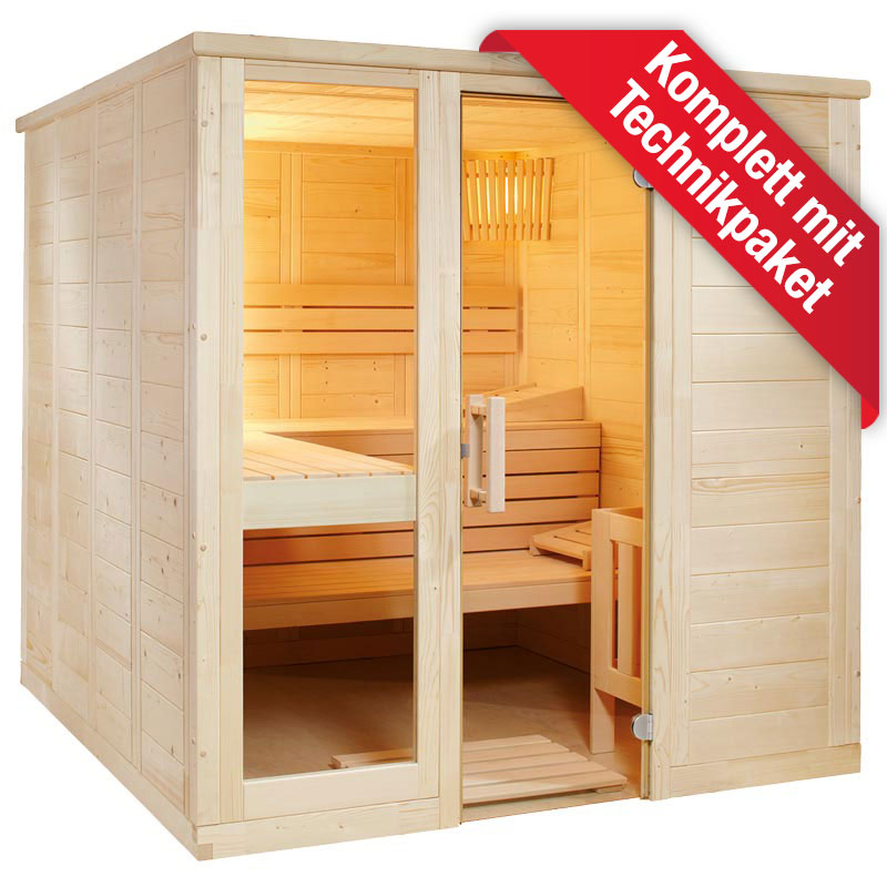 Incl. Sauna-Technikpaket "Finntrend" für klassische Finnische Sauna oder "Combitrend" für Bio-Klimasauna mit Verdampfer.