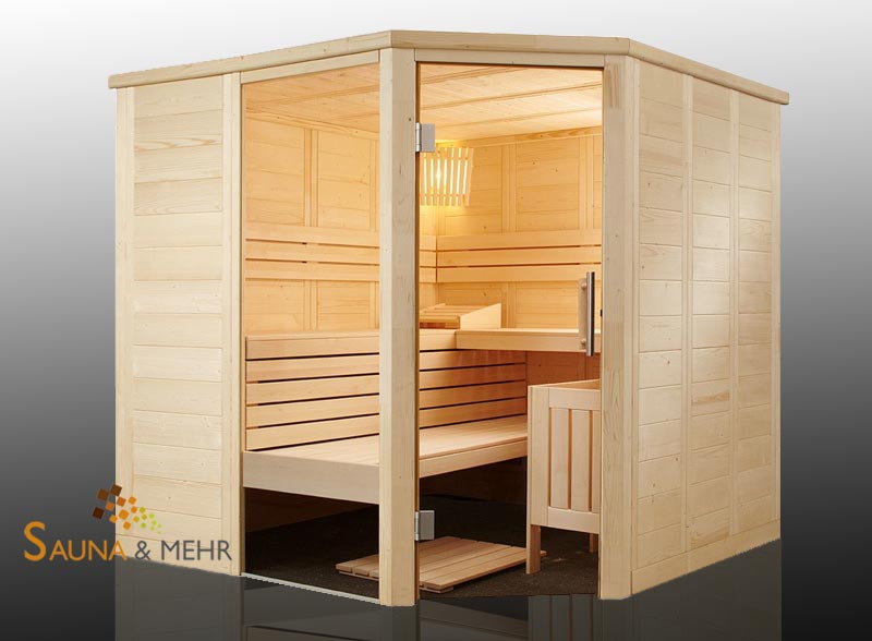 ein besonderes Schmuckstück für Ihren privaten Wellnessbereich. Vorgefertigte Wand- und Deckenelemente aus beidseitig gehobelten 40 mm Bohlen aus massiver Fichte im Verbundsystem vorgefertigt zum Selbstaufbau.