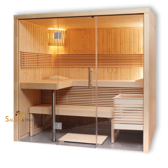 Sauna PANORAMA im Elementbau mit Voll-Glasfront - Fichtepaneele - 214 x 160 cm