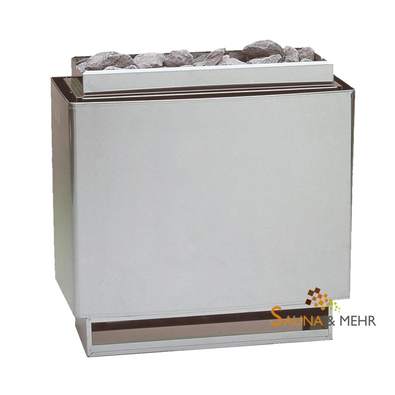 Standofen für die Finnische Sauna in privaten und gewerblichen Saunen. Im geradlinigen und klassischen Edelstahl-Design. Platzsparende flache Konstruktion mit nur 38 cm Tiefe.