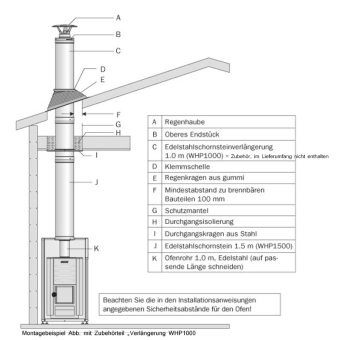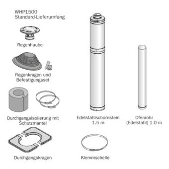 Im Lieferumfang eines Edelstahlschornsteins sind isolierter Edelstahlschornstein, unisoliertes Anschluß-Ofenrohr, Regenhaube, Regenkragen aus Gummi mit Installationsset, Durchgangskragen aus Stahl für die Zwischendecke und Durchgangsisolierung mit Schutzmantel enthalten.