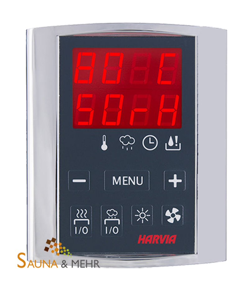 Digitale Kontrolle mit Stil. Vielseitig und einfach in der Handhabung. Harvia Griffin ist ein elegantes digitales Steuergerät der neuesten Generation. Alle Funktionen Ihrer Sauna mit Kombiofen lassen sich ganz einfach steuern. Betriebszeit, Temperatur, Feuchet, Beleuchtung und Belüftung. Die Temperatur und Feuchte kann gradgenau eingestellt werden. Die Meßung erfolgt über Temperatur und Feuchtefühler. Mit der Zeitschaltuhr können Sie mit einer Vorwahlzeit Ihre Sauna einschalten. Der Griffin ist innerlich wie äußerlich beeindruckend. Das digitale Bedienfeld aus Chrom steht im Einklang mit anderen Details moderner Saunen und Bäder. Klein und flach, lässt sich dass Bedienfeld an praktisch jedem trockenen Ort anbringen.