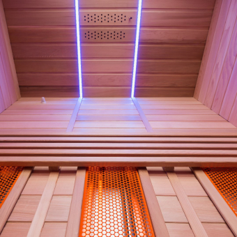 infraWAVE Infrarotkabinen verfügen über eine Fußbodenheizung und sind mit einer profesionellen LED-Farblichtanlage in der Decke ausgestattet.