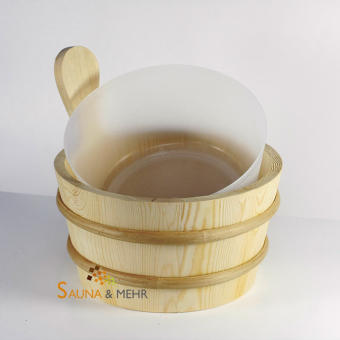 Aufguss Holzkübel aus Kiefernholz in massiver Ausführung mit herausnehmbarem Kunststoffeinsatz.