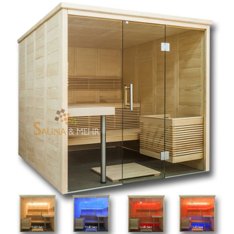 BALANCE View Large Massivholz Sauna 204 x 204 mit LED-Farblicht Ambiente Deckenbeleuchtung und Vollglasfront