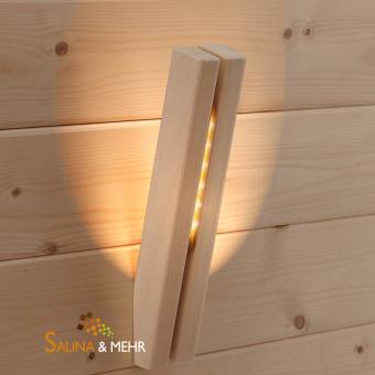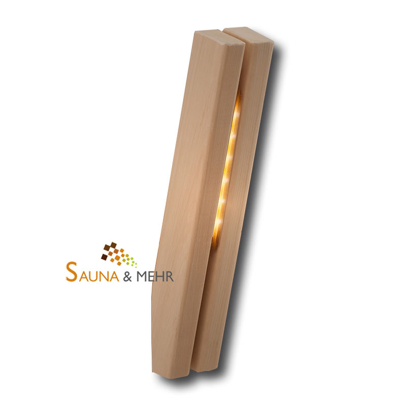 Sauna Innenleuchte für indirektes warmes weisses Licht. Das Anschlusskabel wird außerhalb der Sauna mit einem Netzteil verbunden und kann zum Schalten an die Saunasteuerung angeschlossen werden.