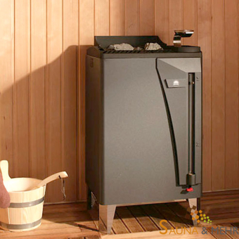 Kombi-Standofen mit Verdampfer für Familien-, Hotel- und gewerbliche Sauna. Optimiertes Verhältnis von Strahlungs- und Konvektionswärme durch die große Steinmenge (60 kg) und einem damit verbundenen kraftvollen Saunaaufguss.