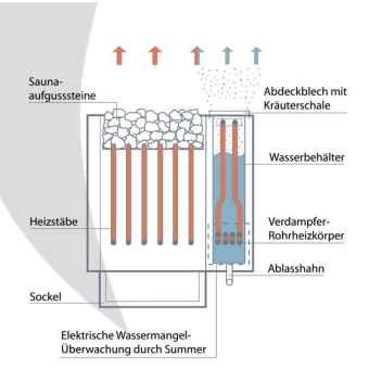 Vielseitiger Kombi-Saunaofen mit Verdampfer für die Finnisch Sauna oder Feuchtbetrieb.