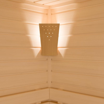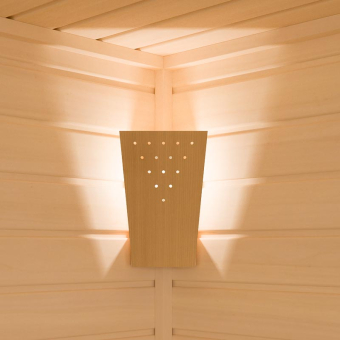 Die neue Saunalampe Moris sorgt durch die indirekte Beleuchtung von warmen Holztönen für eine gemütliche, stimmungsvolle Atmosphäre. Der Blendschirm wird aus edlem Ahornfurnier gefertigt und an der Rückseite mit der LED-Lampe bestrahlt.